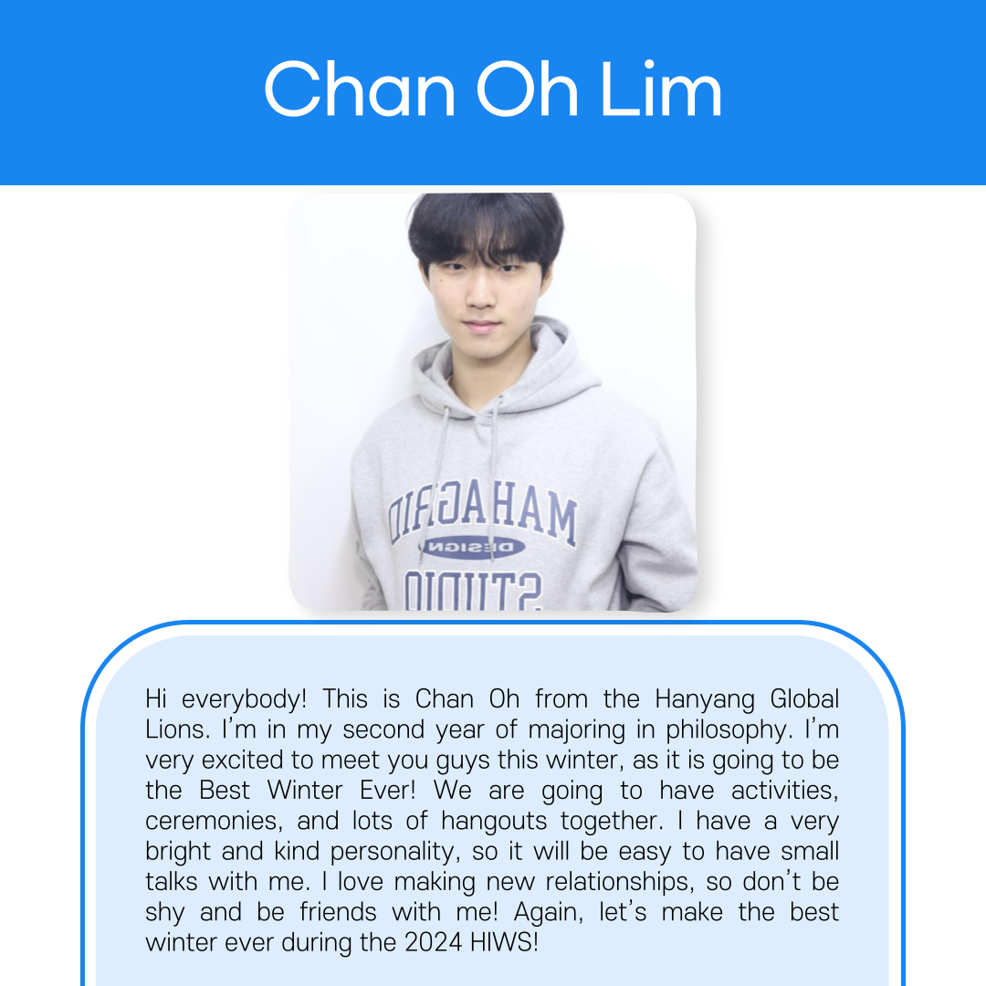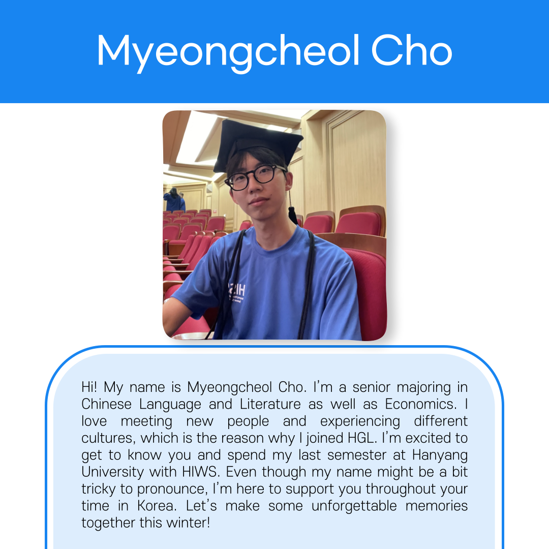 We have a team of six students who will serve as Hanyang Global Lions. Please check the brief information of our team members down below. During the winter, there will be 30~50 volunteer students joining us to help us with the program!